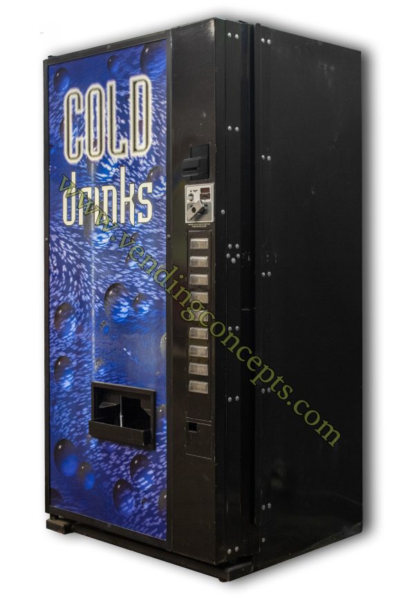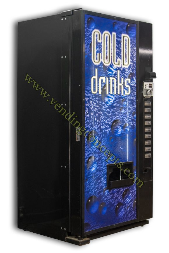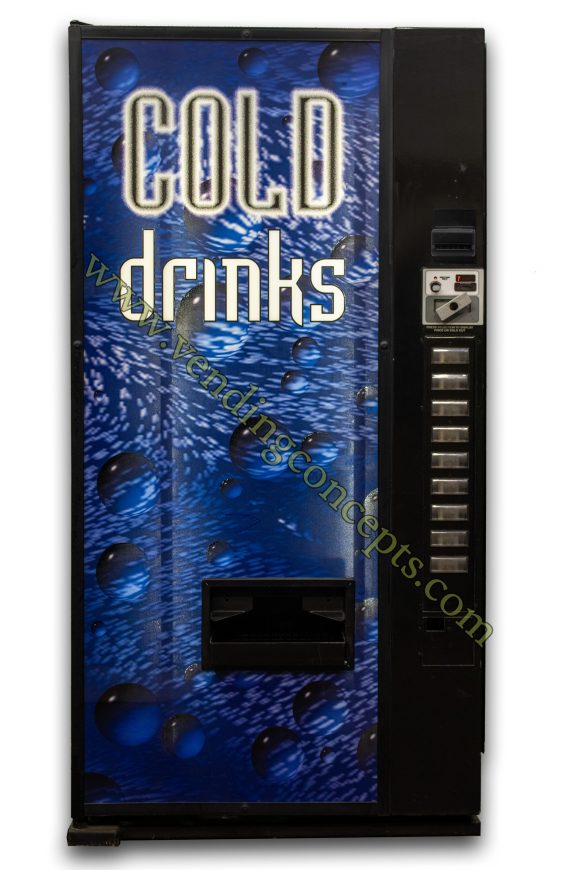 REDUCED PRICE — Heavy graphic fading, nearly transparent. The Dixie Narco 501E-T drink vending machine is credit card reader compatible, has 9 selections, and can hold approximately 500 12 oz drinks or 250 bottles! This high performance and reliable Dixie Narco 501E-T is ideal for the garage, man cave, mechanic shops, warehouses, or other places where the appearance of the machine is not a concern.