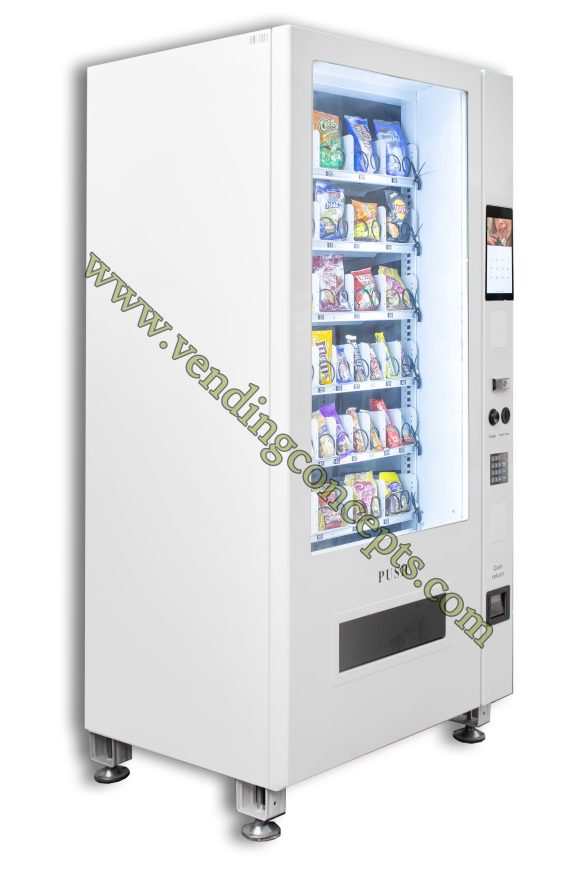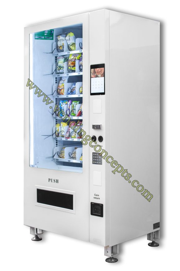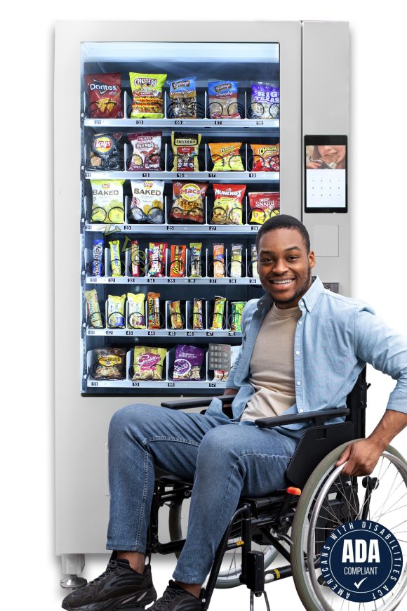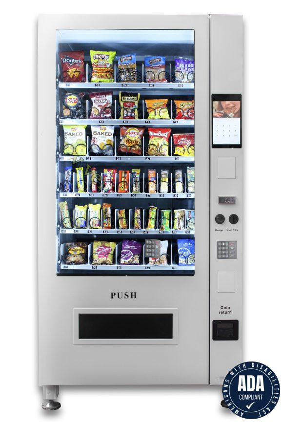 The VC 8010-10S ADA (American Disabilities Act) full size snack machine comes standard with 20 chips / pastry selections and 20 candy selections for a total of 40 selections! The 10” Touch Screen allows the operator the ability to upload video and sell advertising for an additional revenue stream.It is fully customizable and can also use conveyor belts instead of spirals. It has vend sensors, LED lighting and a modern design…your best choice to maximize revenue streams for the least amount of investment.