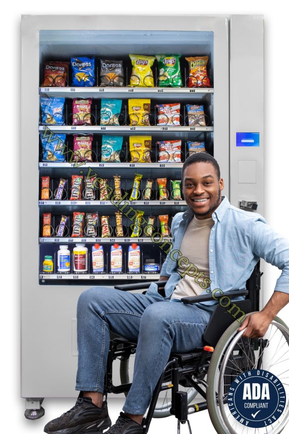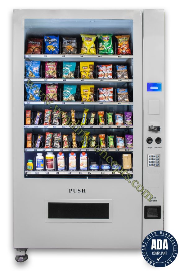 The VC 8012-5S ADA snack machine is the largest and most versatile snack machine on the market today! It is not only ADA (American Disabilities Act) compliant but it comes factory set with a standard full shelf of conveyor belts (10 selections) and 18 chip/pastry selections and 24 candy selections for a total of 52 selections!