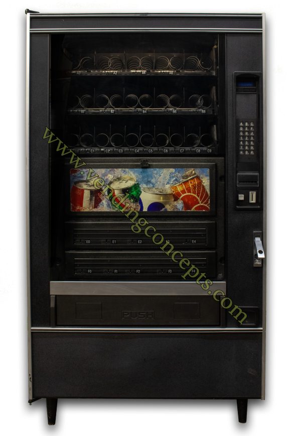 12 oz cans only. The Crane National Vendors 797D is credit card reader compatible, extremely user-friendly combo vending machine and has an upgraded machine door which gives it an even more modern look! It can sell 10 chip/snack items, 10 candy items and 10 12oz canned selections. The Crane National Vendors 797D is perfect for laundrymats, office breakrooms, and cafeterias!