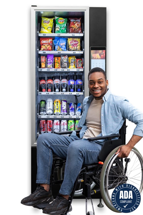 The VC 7206-10D ADA compliant glass front beverage machine with our all new 10'' touchscreen tablet allows the user to use the shopping cart feature to make multiple purchases creating larger sales and more revenue! Our standard factory setting comes with 6 shelves and 36 selections drink selections!  This machine can be used in environments that require compliance with the ADA (American Disabilities Act)!  It is factory equipped with a backend management software. You can track sales & inventory, run reports, get alerts if your machine has a malfunction, etc. This machine can interface with all the latest payment platforms such as Grab Pay, Touch N Go, Boost, Maybank, QQR, Paywave, Payrange, Google Pay, Apple Pay and more.