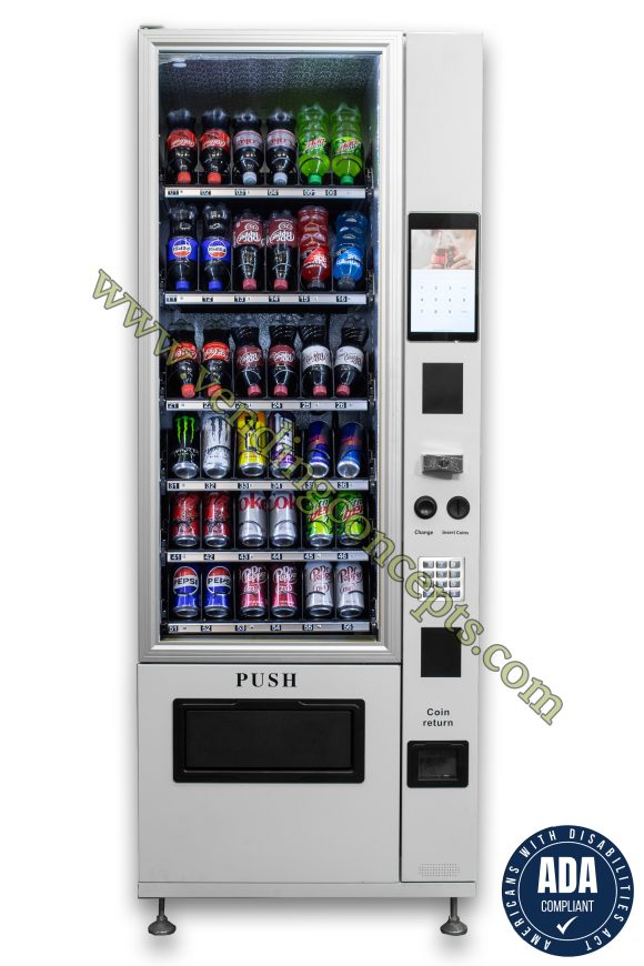 Introducing the new tablet powered VC 7206-10D ADA compliant Slim-Max glass front drink vending machine! Sell advertising, upload videos, offer promotions with the 10” tablet & displace your competitors by offering these superior benefits to facility managers. With the tablet and flexibility to sell specialty beverages (coffee, Redbull etc) and various container sizes without the use of shims, ROI will far exceed the old industry standards! It is perfect for tight spaces or add it to a bank of equipment! The width is less than 29”, boasting 6 customizable shelves and a fully refrigerated cabinet!