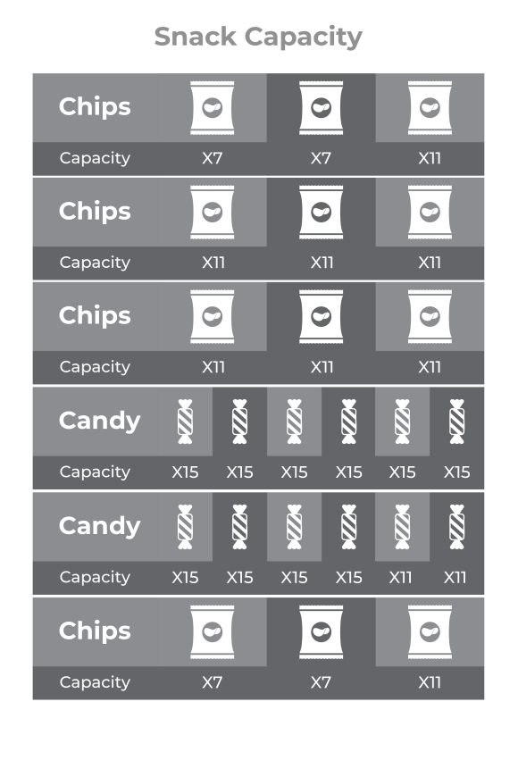 The VC 7206-10S ADA is modular so the shelves can be altered to have larger or smaller sizes as well as the selections. Selections can be spaced out to have less choices to accommodate larger products. FULL CUSTOMIZATION AVAILABLE! The standard configuration using traditional spirals can be changed out  for a conveyor system (custom charges apply) to accommodate odd sized products, which adds great flexibility to what kind of products the machine can vend.
