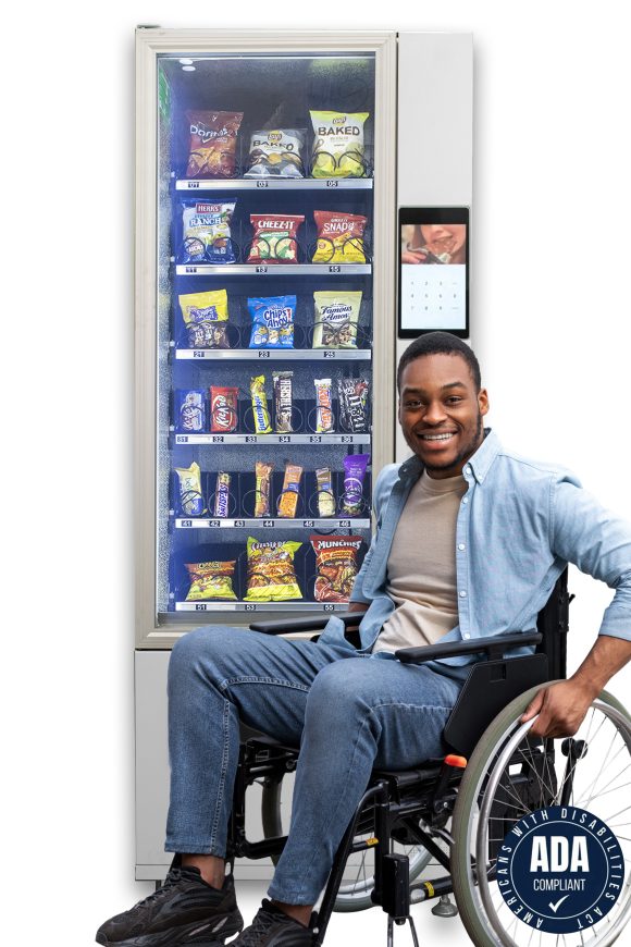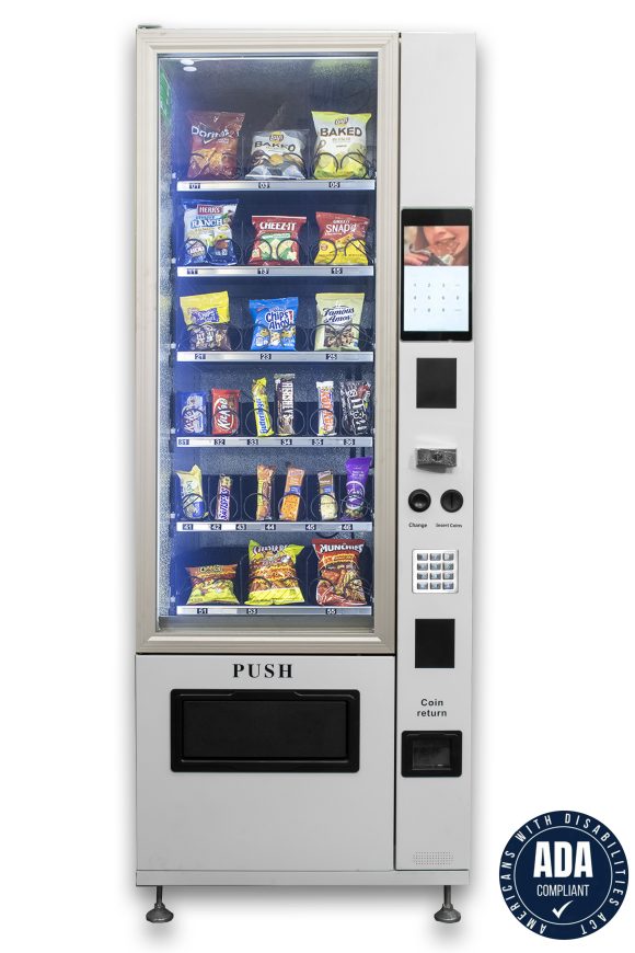 Less than 29” wide, the VC 7206-10S ADA (American Disabilities Act) is great for maximizing sales in tight spaces! Customizable shelves and selections, a durable body and guaranteed-vend delivery system.  The 10” Touch Screen allows the operator the ability to upload video and sell advertising for an additional revenue stream.It is fully customizable and can also use conveyor belts instead of spirals. It comes standard with vend sensors, LED lighting and a modern design.