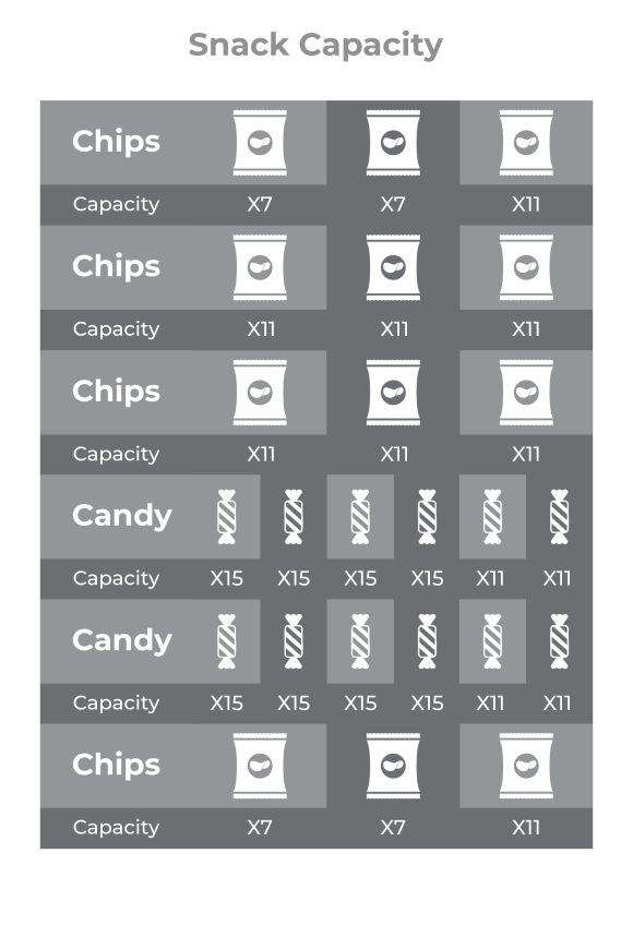 | Capacity | 24 selections, 172 candy, 116 pastry/chip items |