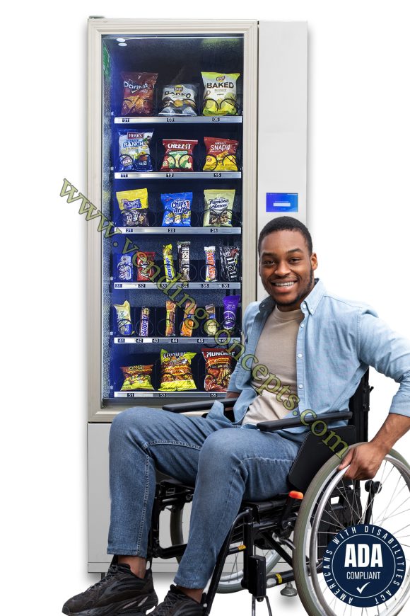 Less than 29” wide, the VC 7206-5S ADA (American Disabilities Act) is great for maximizing sales in tight spaces! Customizable shelves and selections, a durable body and guaranteed-vend delivery system. It is fully customizable and can also use conveyor belts instead of spirals. It comes standard with vend sensors, LED lighting and a modern design.