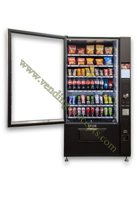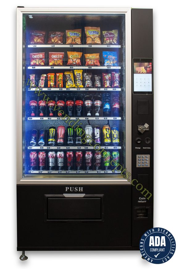 The new tablet powered VC 7210-10C ADA compliant combination vending machine! Sell advertising, upload videos, offer promotions with the 10” tablet & displace your competitors by offering these superior benefits to facility managers. With the flexibility to sell specialty beverages (coffee, red bull etc) without the need for shims. Sell snacks or just as easily non-traditional vending products! ROI will far exceed the old industry standards! Our standard configuration boasts 6 customizable shelves , LED lighting, vend sensors and a fully refrigerated cabinet and with a maximum capacity of 50 selections!