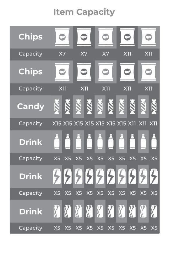 | Snack Capacity | 20 selections, 138 candy, 98 pastry/chip items |