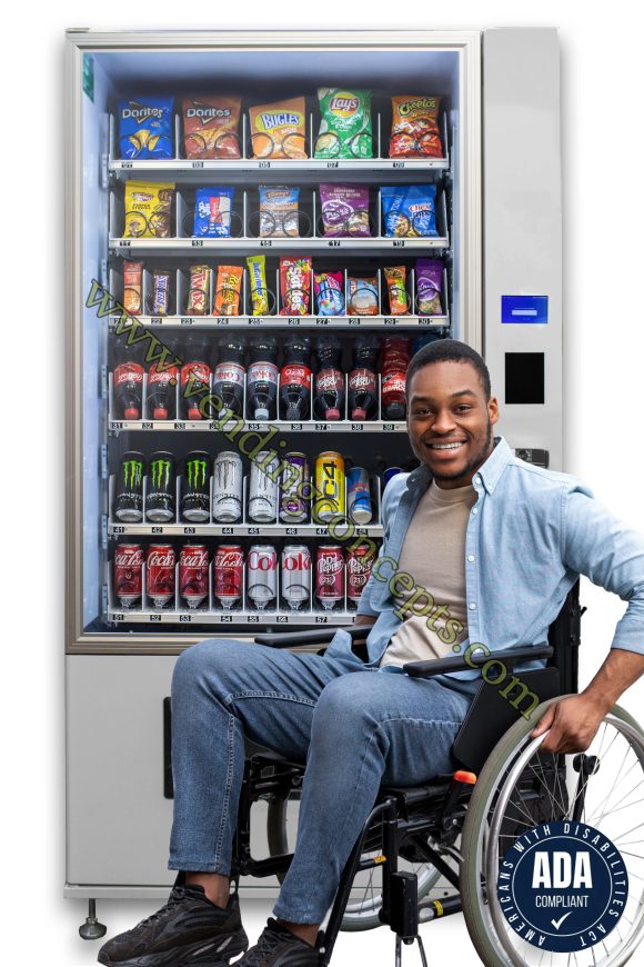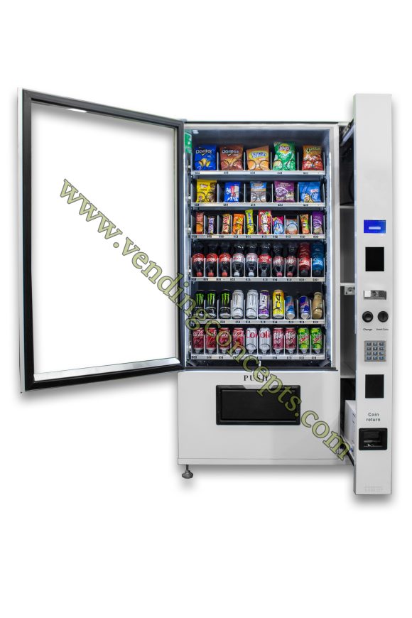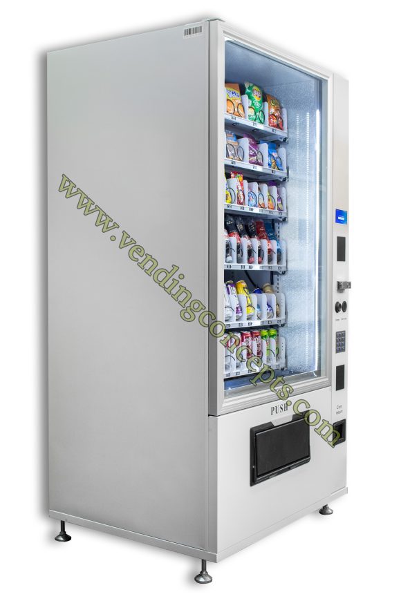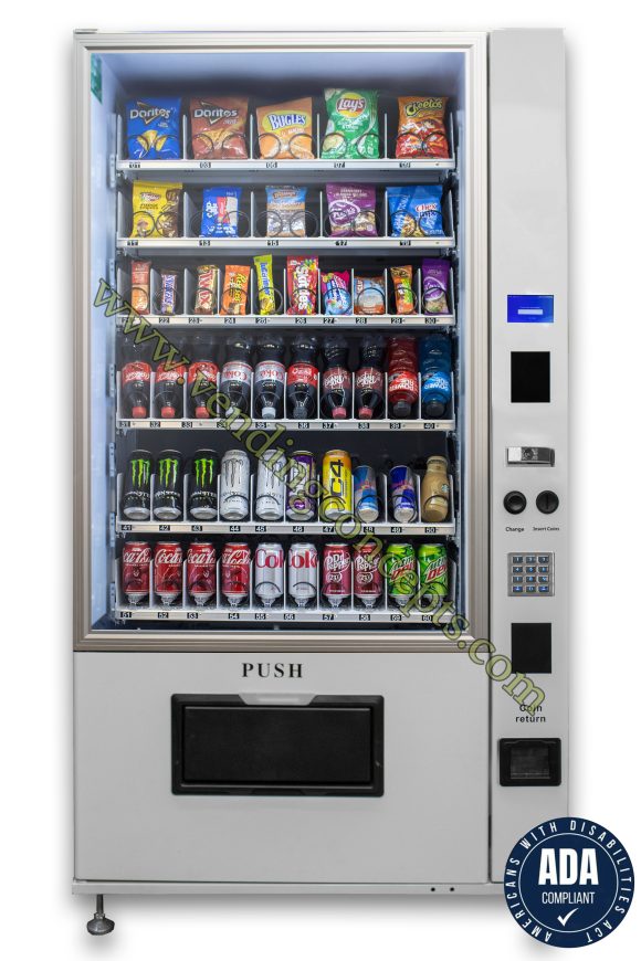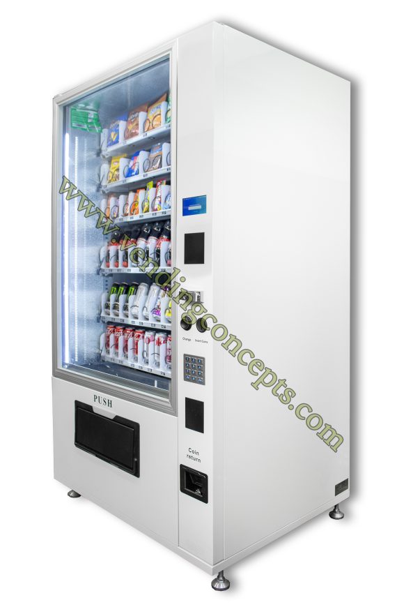 The new VC 7210-5C ADA compliant combination vending machine! With the flexibility to sell specialty beverages (coffee, Red Bull etc) without the need for shims. Sell snacks or just as easily non-traditional vending products! ROI will far exceed the old industry standards! Our standard configuration boasts 6 customizable shelves, LED lighting, vend sensors and a fully refrigerated cabinet and with a maximum capacity of 50 selections!