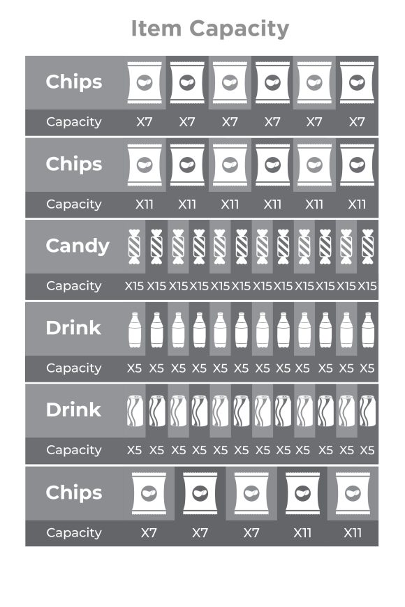 | Snack Capacity | 30 selections, 138 Candy (12 selections), 98 Chip/Pastry items (12 selections), 30 Flex items (6 selections) |