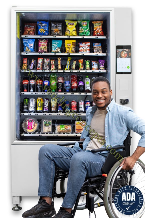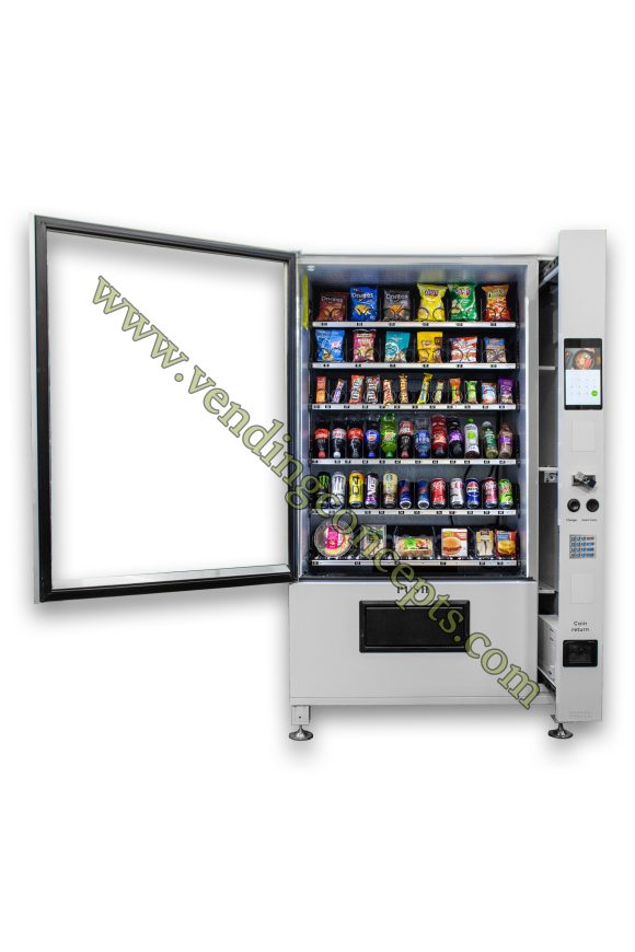 The VC 7212-10C ADA Compliant 6 Wide Combination Vending Machine is the total solution for today’s new world of technology! It can vend drinks, snacks, food or any combination of the three and do it without shims!! It comes with 6 shelves (one converyor belt shelf, 5 traditional spiral shelves) in our standard set! Boasting 24 drinks, 12 chip/pastry, 12 candy and 6+ flex items (food or snack) for a total of 54 selections! The 10” Touch Screen allows the operator the ability to upload video and sell advertising for an additional revenue stream.