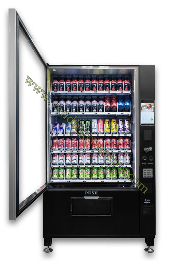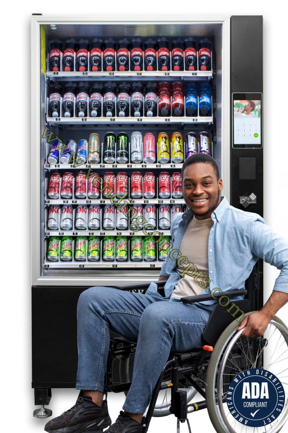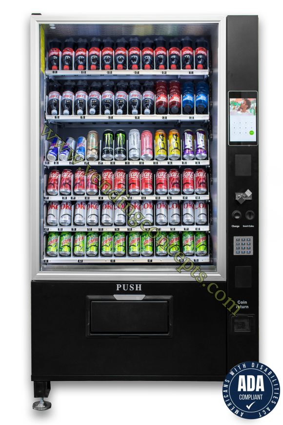 The VC 7212-10D ADA Compliant 6 Wide Glass Front Drink Machine is the total solution for today’s new world of technology! It comes with 6 shelves and a whopping 72 selections in our standard set. No other machine can match 72 selections!! The 10” Touch Screen allows the operator the ability to upload video and sell advertising for an additional revenue stream. No shims are needed to vend different size drinks!