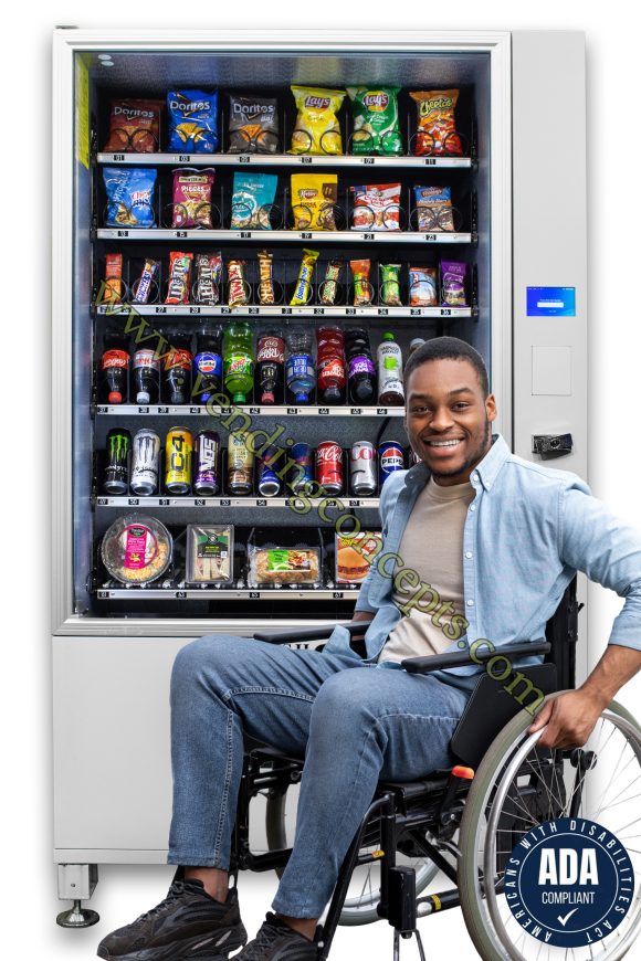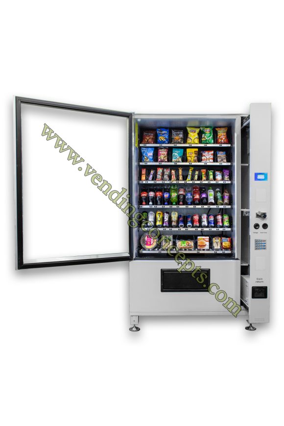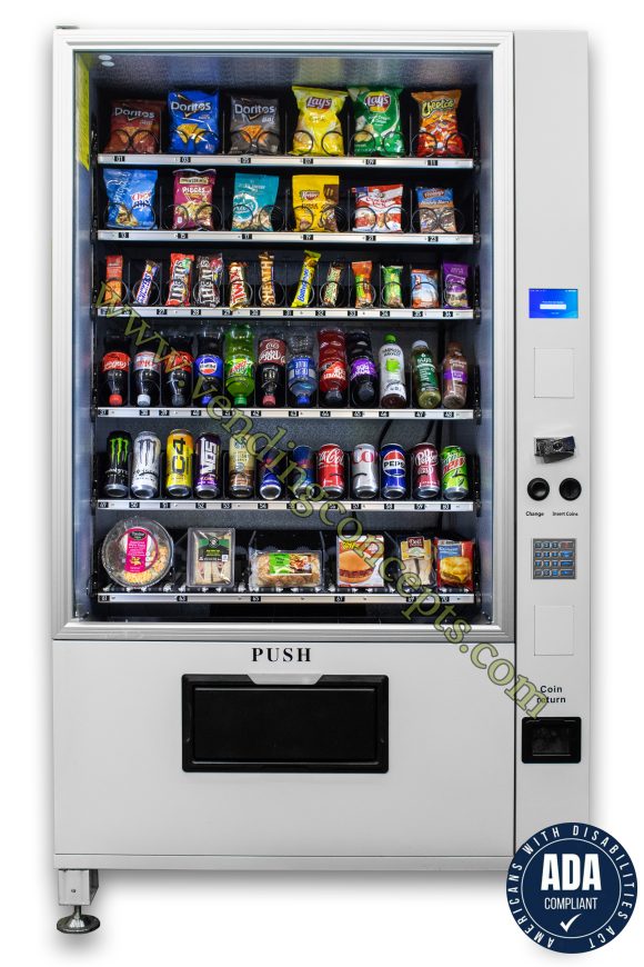 The VC 7212-5C ADA Compliant 6 Wide Combination Vending Machine is the total solution for today’s new world of technology! It can vend drinks, snacks, food or any combination of the three and do it without shims!! It comes with 6 shelves (one converyor belt shelf, 5 traditional spiral shelves) in our standard set! Boasting 24 drinks, 12 chip/pastry, 12 candy and 6+ flex items (food or snack) for a total of 54 selections!