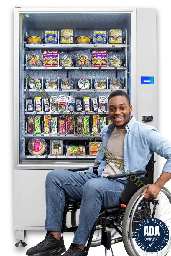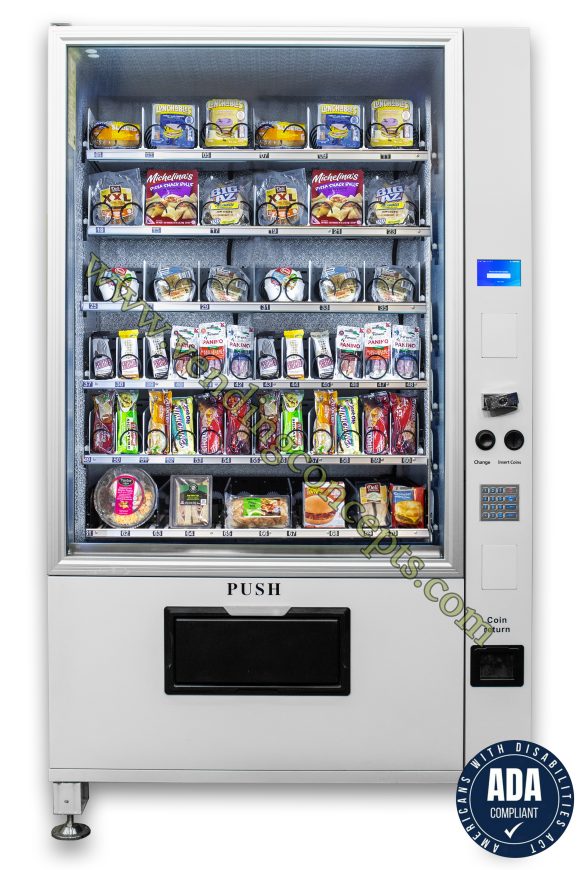 The VC 7212-5F ADA Compliant 6 Wide Cold Food Vending Machine is the total solution for today’s new world of technology! It comes with 6 shelves (one converyor belt shelf, 5 traditional spiral shelves) in our standard set! Boasting 18 sandwich size , 24 Burrito size / 6 + Flex size with conveyor belts (food or snack) for a total of 48 selections.