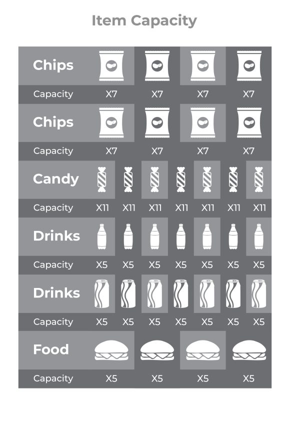 | Snack Capacity | 15 selections, 58 Chip/Pastry Items (6 selections), 135 Candy Items (9 selections) |