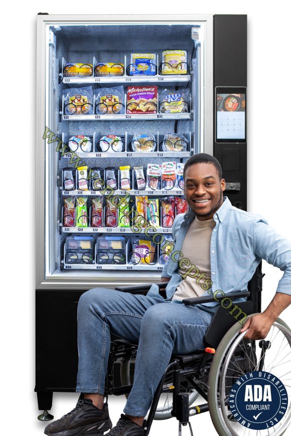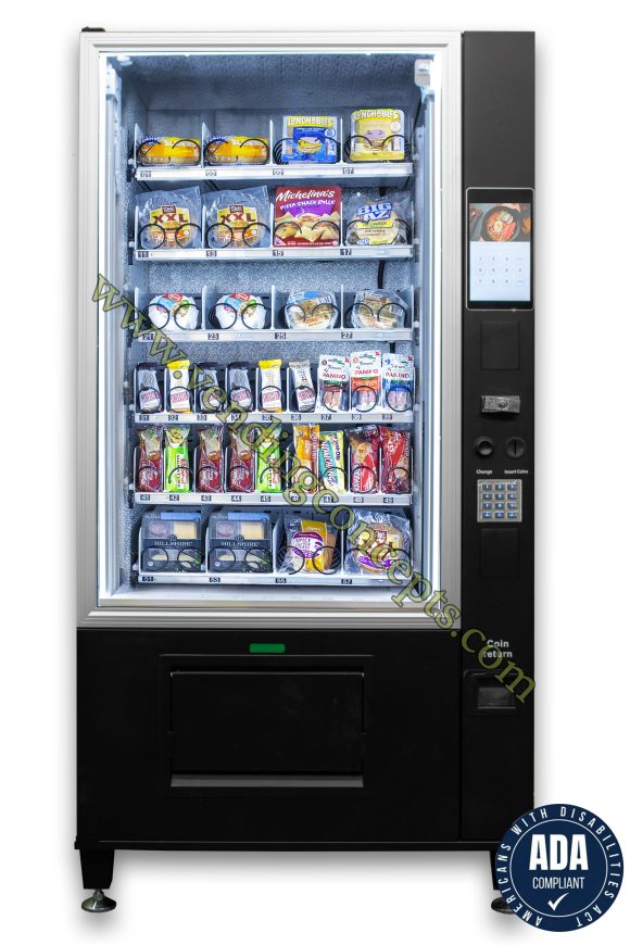 Step into the future with the new tablet powered VC 9009-10F Super Flex cold food vending machine! Sell advertising, upload videos, offer promotions, use the new features to upgrade your best customers or better yet, displace your competitors by offering these superior benefits to facility managers. The VC 9009-10F Super Flex cold food vending machine merchandiser, comes standard with 6 full shelves & a 10” Touch Screen. The Super Flex cold food machine has a customizable design, equipped with an industry leading elevator system, you’re able to sell fragile glass items, electronics, PPE Supplies, beauty products and more. With our Age Verification Technology (purchased separately) you can sell fragile products, odd packaged food, glass containers and just about anything else!