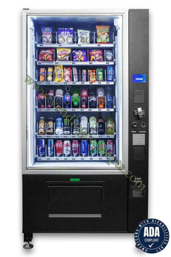 The VC-9009-5C ADA compliant combination vending machine, comes standard with 6 full shelves of selling space in a very small footprint! It is the best solution for limited space and full coverage of all vending products, equipped with an the Intelevator system, giving flexibility to sell fragile products & all the traditional vending needs such as drinks & snacks.