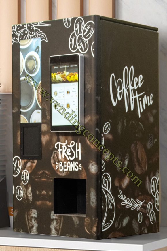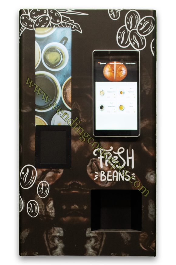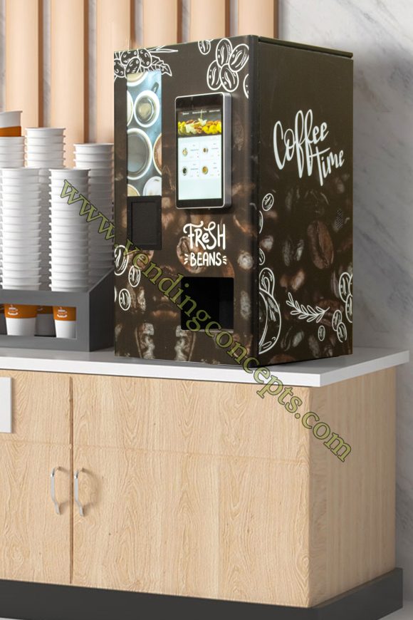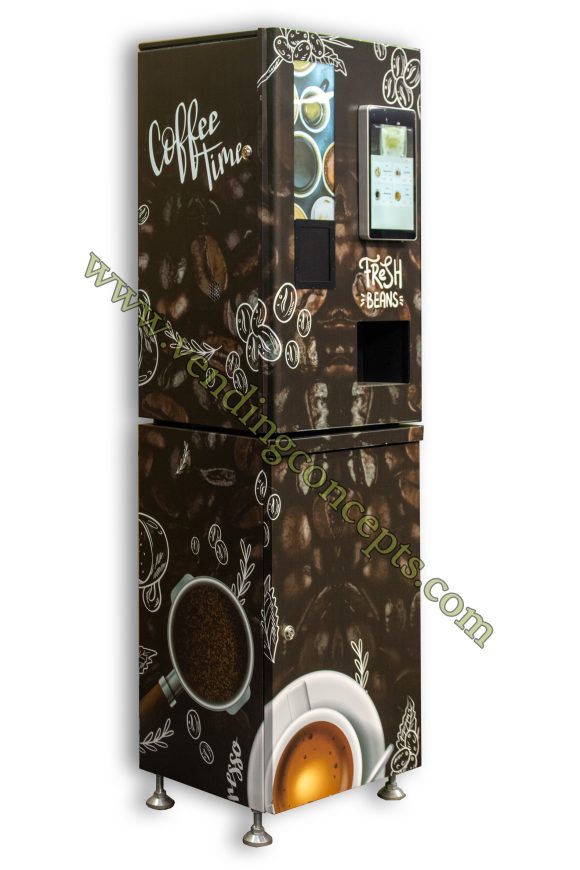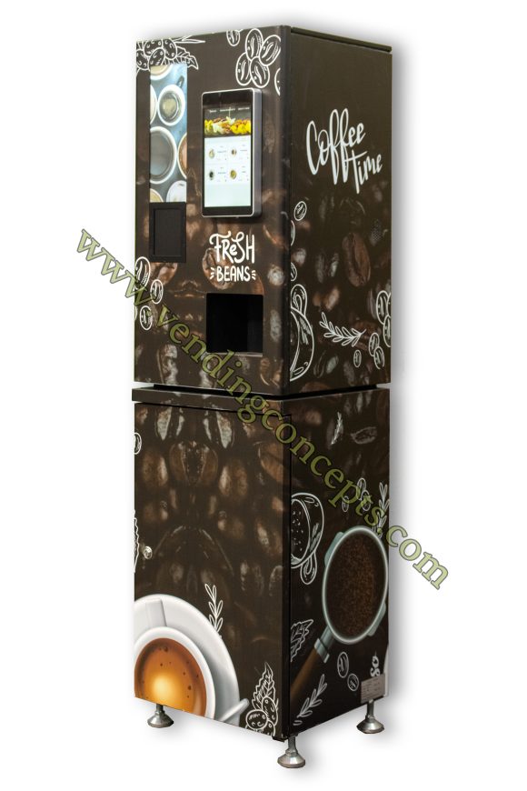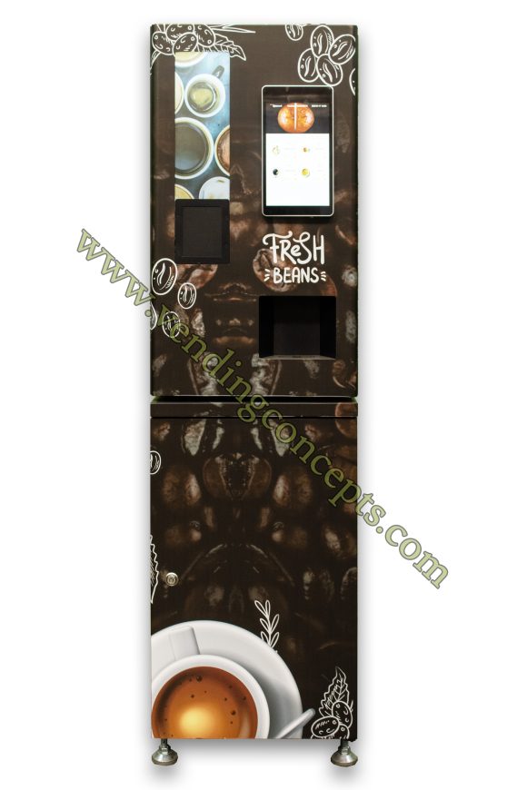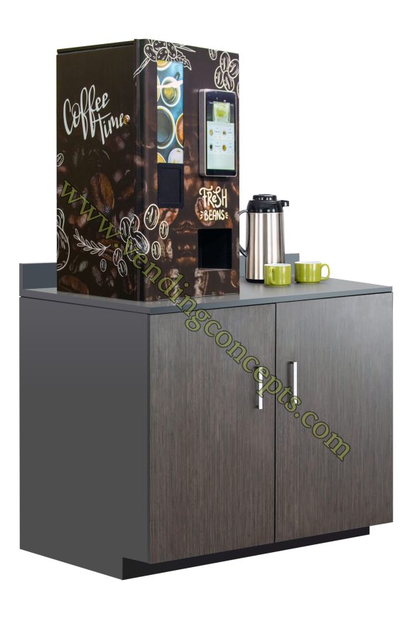 The VC CF4N-10 counter top bistro comes powered with a 10” touchscreen! Sell advertising, upload videos, offer promotions and make more money while offering the ultimate cup of coffee! Using fresh whole beans & a Swiss made bean grinder, it makes a great cup of coffee very fast! Only 25 seconds for instant hot drinks or up to 60 seconds for a specialty cup of coffee! Add a matching stand if you don’t have a counter to place it on. This machine offers a great variety of hot drinks in a very small cabinet with 3 canisters for different powders.