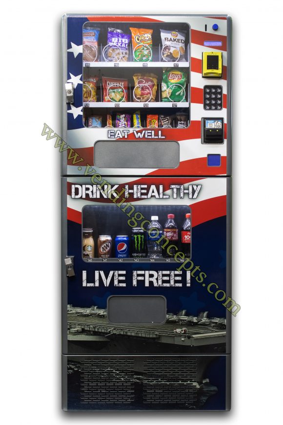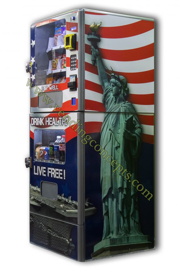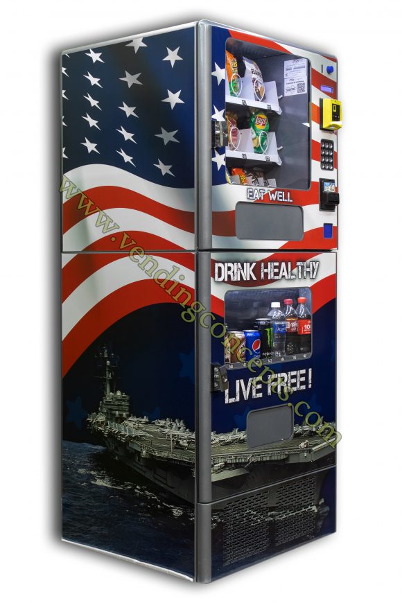 The VC JDL2C “Live Free” Edition has been styled with an amazing Patriotic graphic undoubtedly grabbing the attention of any person passing by! 30″ wide & 29″ deep, this machine is designed to serve locations with limits on space – but don’t let its size fool you, it still packs a punch! You’ll have the option to sell sodas, energy drinks, bottled water, and 20oz bottles like Gatorades; additionally, it offers 8 larger chip/pastry selections and 8 smaller snack selections – like candies and granola bars. The VC JDL2 can be fashioned with a credit card reader providing additional payment options like Apple Pay, Google Pay, and more!