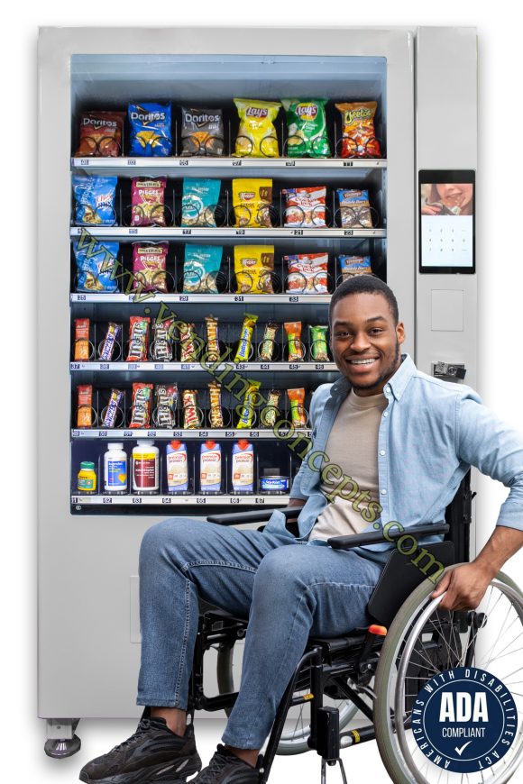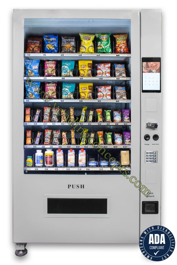 The VC NC12-10S ADA snack machine is the largest capacity ambient machine available today! It is a little deeper than the standard depth so you can fit more but still designed to fit through a commercial door! It is not only ADA (American Disabilities Act) compliant but it comes factory set with a standard full shelf of conveyor belts (10 selections) and 18 chip/pastry selections and 24 candy selections for a total of 52 selections! Powered by a 10” touchscreen, the operator has the ability to upload video and sell advertising for an additional revenue stream!