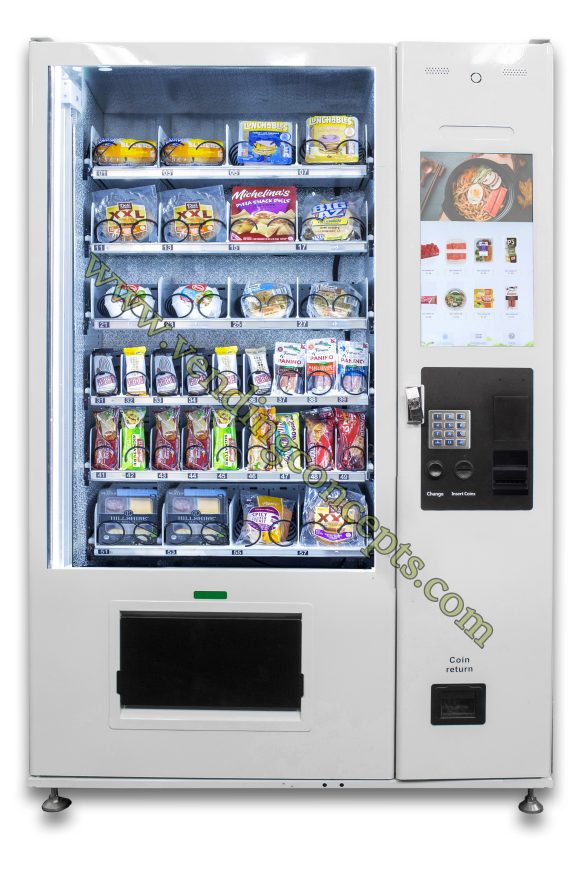 Intelligent elevator platform and customizable selections really sets the VC 9009-22F apart from the rest! This machine also offers the option to replace the spirals in each selection to a unique conveyor belt system – allowing it to delicately push an assortment of valuable or fragile items to the elevator platform – for a gentle vend every time. The VC9009 22F is a refrigerated food machine, with a 22-inch touch screen display, capable of offering 20 standard food size selections (i.e. lunchables, hot pockets, etc.) and 20 smaller food selections – depending on product size and shelf configuration. These selections can be customized to vend food items of unusual size if necessary. Reliability, durability, advertising, and selling capabilities from this machine are truly second to none and will give you the edge you’re looking for against all competitors! Other than a cheaper price, what else can you ask for?!