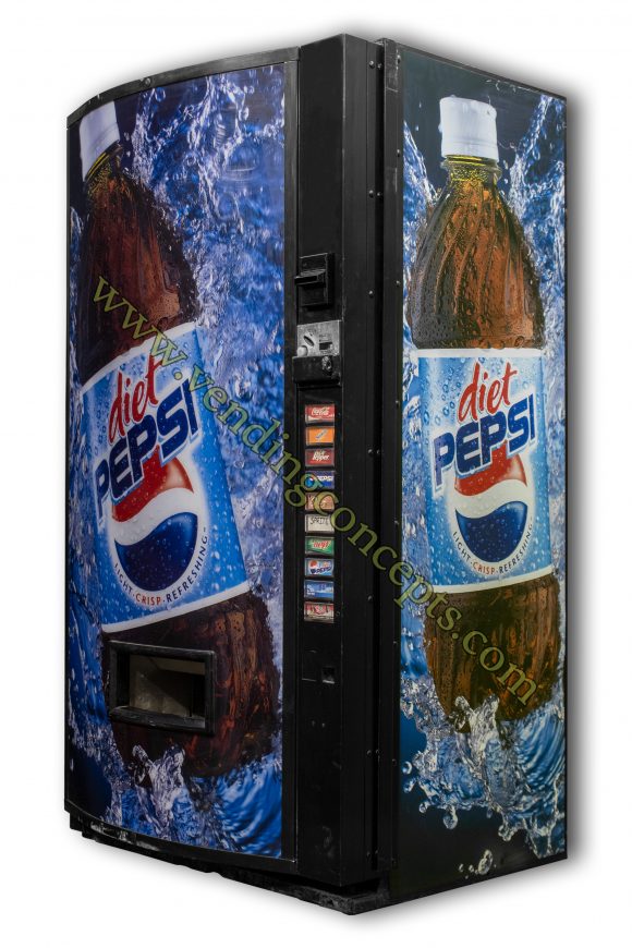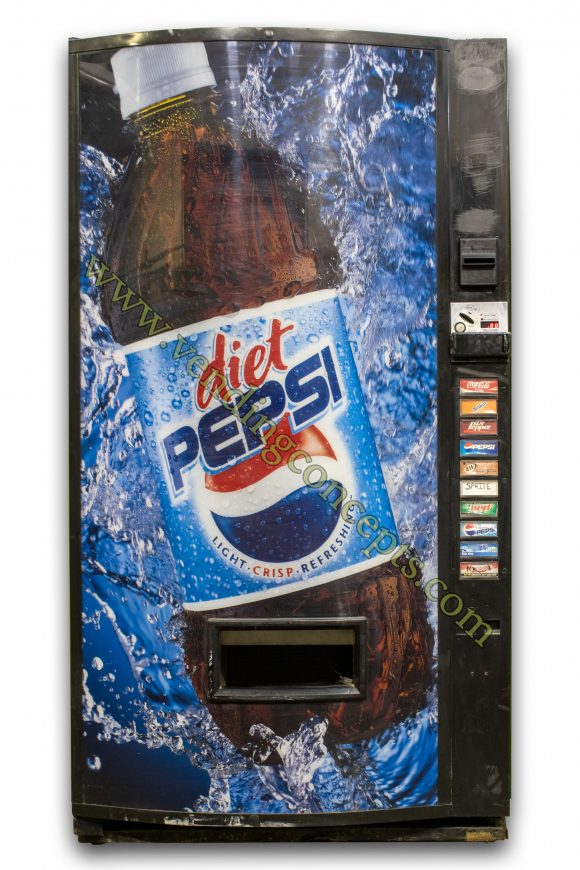 Heavy scuffing on door, but the entire exterior black cabinet can be repainted while keeping the rare Diet Pepsi graphics, for an additional cost of $300.00. Call for details! The Vendo V480P drink machine is a 12 oz can, 16/16.9 oz bottle water and 20 oz dispenser.  It offers 10 selections, while other drink machines only offer 8 or 9!